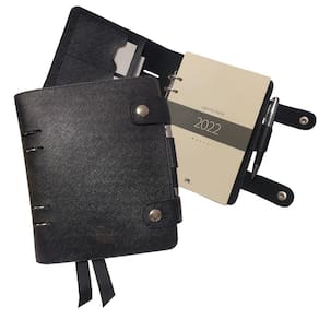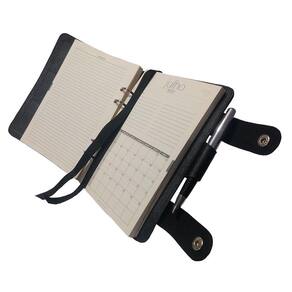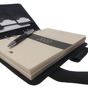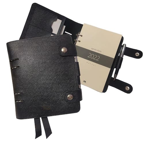 Agenda modelo envelope tipo fichário contendo, dados pessoais, calendários, datas importantes, anotações mensais, planejamento mensal, um dia por página (com exceção dos finais de semana), planejamento para o próximo ano, índice telefônico e lateral com marcações mensais.