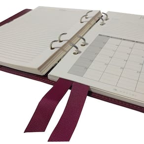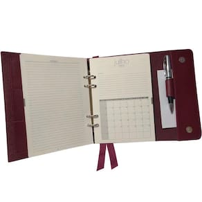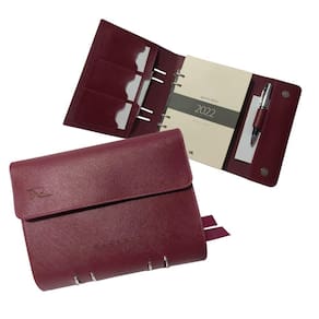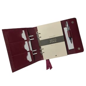 Agenda diária Raffai tipo fichário contendo, dados pessoais, calendários, datas importantes, anotações mensais, planejamento mensal, um dia por página (com exceção dos finais de semana), planejamento para o próximo ano, índice telefônico e lateral com marcações mensais.