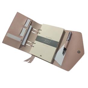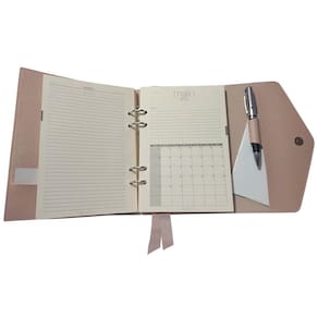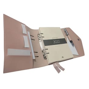 Agenda modelo envelope tipo fichário contendo, dados pessoais, calendários, datas importantes, anotações mensais, planejamento mensal, um dia por página (com exceção dos finais de semana), planejamento para o próximo ano, índice telefônico e lateral com marcações mensais.