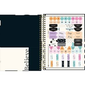 Design Incrível: Uma capa dura com detalhes metalizados e um espiral colorido que adicionam um toque de glamour ao seu dia a dia. O fechamento com elástico garante que suas anotações e planos fiquem sempre seguros.