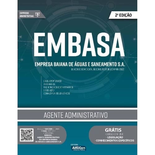 A OBRA DE ACORDO COM O EDITAL DE CONCURSO PÚBLICO Nº 001/2022 A chance de fazer parte do Serviço Público chegou, e a oportunidade está no concurso para AGENTE ADMINISTRATIVO - EMPRESA BAIANA DE ÁGUAS E SANEAMENTO SA - EMBASA - 2ª EDIÇÃO. Para ingressar nesta carreira, é fundamental que a preparação para a prova seja feita de forma eficaz - com os materiais certos. Isto é, neste universo dos concursos públicos, estar bem-preparado faz toda a diferença. Por isso, a Editora AlfaCon, sempre atenta e preocupada com nossos concurseiros, apresenta esta obra diferente e perfeita para você. Nesse sentido, no decorrer dos assuntos, o estudante encontrará dicas para a sua compreensão. Toda essa disposição foi pensada para auxiliar o concurseiro, a obter sucesso na carreira que almeja. Conteúdos contemplados Língua Portuguesa Informática Raciocínio Lógico e Matemático Legislação Conhecimentos Específicos ON-LINE ? Legislação ? Conhecimentos Específicos O AlfaCon preparou todo o material com explicações, reunindo os principais conteúdos relacionados a prova, dando ênfase aos tópicos mais cobrados. ESTEJA ATENTO AO CONTEÚDO ONLINE POR MEIO DO CÓDIGO DE RESGATE, para que você tenha acesso a mais conteúdo. Desfrute de seu material o máximo possível, estamos juntos nessa conquista!