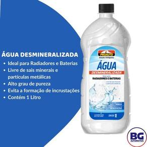 Água Desmineralizada 1l Proauto Ideal Baterias e Radiadores A Água Desmineralizada Proauto é ideal para ser usada em baterias automotivas e sistemas de refrigeração de motores. Seu processo de purificação, remove impureza e outros sais minerais que ajudam a proteger partes internas do sistema de refrigeração da oxidação. -ideal para Radiadores e Baterias -livre de sais minerais e partículas metálicas. -alto grau de pureza -evita formação de incrustações
