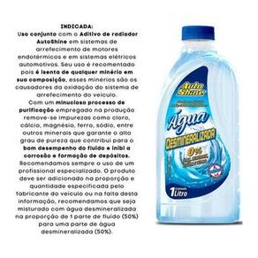 Água Desmineralizada A Água Desmineralizada AUTOSHINE, é indicada para aplicação em sistemas de arrefecimento de motores endotérmicos e também em sistemas elétricos automotivos.