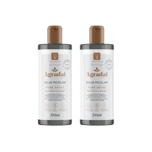 Descrição: A Água Micelar Agradal Pure Detox 200ml é um cuidado purificante para a pele, formulado para remover delicadamente impurezas, maquiagem e resíduos poluentes. Sua fórmula micelar eficaz combina tecnologia avançada de limpeza com ingredientes suavizantes, proporcionando uma sensação de frescor e pureza à pele. Pure Detox é enriquecida com micelas, que agem como ímãs, atraindo e eliminando as impurezas sem agredir a barreira natural da pele. Além disso, conta com ativos detox que auxiliam na revitalização cutânea, promovendo uma aparência mais saudável e luminosa. Modo de Uso: 1. Aplique a Água Micelar Agradal Pure Detox em um algodão. 2. Passe suavemente sobre o rosto, olhos e lábios, removendo maquiagem e impurezas. 3. Não é necessário enxaguar, permitindo que os agentes micelares continuem agindo na pele. 4. Use de manhã e à noite como parte da rotina de cuidados com a pele. 5. Siga com seu hidratante ou tratamento facial habitual.