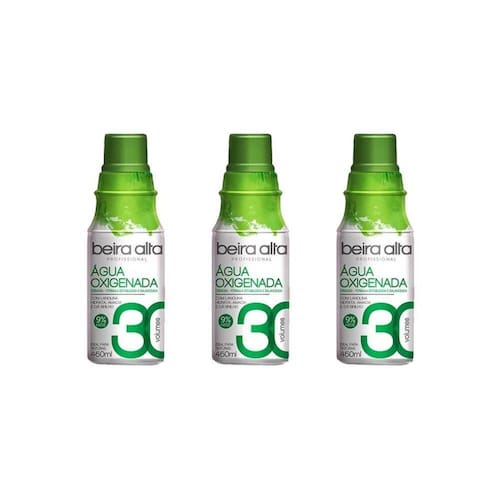 Descrição: Água Oxigenada Beira Alta 30 Volumes 450ml. A Água Oxigenada Beira Alta 30 Vol 9% H2O2 é indicada para tinturas de tons médios. Clareia de 2 a 3 tons, contém Lanolina, emoliente especial para processos químicos, que hidrata, proporciona brilho, evitando o ressecamento dos cabelos.