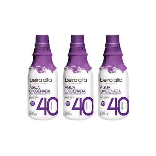 Descrição: Água Oxigenada Beira Alta 40 Volumes 900ml. Informações do Produto: A Água Oxigenada Beira Alta 40 Vol 12% H2O2 é indicada para tinturas de tons claríssimos, podendo clarear até 5 tons. Contém Lanolina, emoliente especial para processos químicos, que hidrata, proporciona brilho, evitando assim o ressecamento dos cabelos.