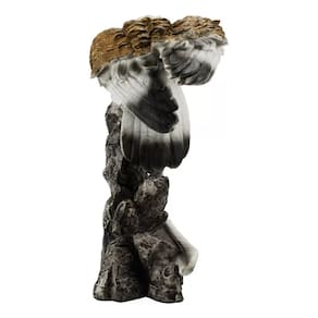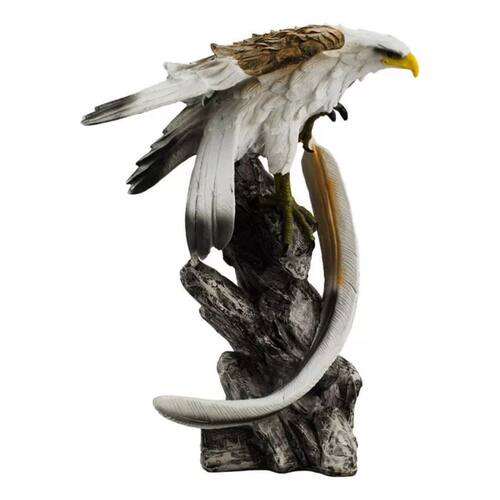 Enfeite decorativo no formato de uma águia em cima da rocha decorado com uma pena longa. Peça com 24.5 cm de altura e 13 cm de largura. Cores realista. Material: resina