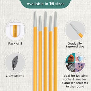 - Agulhas de ponta dupla: as agulhas de ponta dupla vêm em um pacote de 5 agulhas e são úteis para projetos que exigem tricô redondo. Estas agulhas funcionam em uma combinação de 4 ou 5, dependendo do padrão e do item que está sendo tricotado.