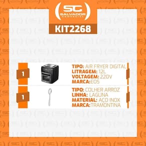Muito importante:-- conferir produtos no ato do recebimento. Não aceitar produtos com embalagem violada amassado, rasgado, aberto, quebrado, etc , a recusa deve ser feita no ato.Componentes do kit:1 - fritadeira sem óleo air fryer oven digital toutch titanium 12l premium eaf12t 220v - eos1 - colher para arroz laguna em aço inox - tramontina 63906100conjunto fritadeira air fryer digital eaf12t 220v eos e colher para arroz laguna tramontinaeleve sua experiência na cozinha com o conjunto fritadeira air fryer digital eaf12t 220v eos, acompanhado pela prática colher para arroz laguna tramontina. Esta combinação inteligente une a tecnologia avançada da fritadeira air fryer eos com a qualidade reconhecida da tramontina. A fritadeira digital oferece uma maneira saudável de preparar uma variedade de pratos, enquanto a colher para arroz facilita o manuseio e a servir de suas refeições favoritas. Com este conjunto, você pode desfrutar de refeições deliciosas e nutritivas sem comprometer o sabor.90 dias de legal para defeitos de fabricação.Informações técnicas:fritadeira air fryer- painel digital touch: prepare suas receitas com apenas um toque;- 9 funções, em um só produto: a airfryer conta com 9 funções para você preparar qualquer tipo de receita;- porta removível: porta removível, para facilitar a limpeza no seu dia a dia;- tecnologia twist fry: suas receitas prontas em menos tempo. Mais saúde sem utilizar óleo;- 3 em 1: frita sem óleo, assa e desidrata preservando a qualidade do alimento, mantendo o aroma e o sabor;- portátil: leve e prática, possibilita levar para qualquer lugar facilmente.- modelo: eaf12t;- voltagem: 220v;- frequência: 60hz;- cor: titanium;- sku salvador comercial: 014050- : 12 meses;- potência: 1800w;- consumo máximo: 1,8kw/h;- capacidade: 12 litros;- painel: digital touch;- 9 funções pré programadas;- timer ajustável de até 90 min;- temperatura ajustável até 200c;- porta removível para facilitar limpeza.Colher para arroz- linha: laguna- material: aço inox- pode ser lavada em máquinas de lavar louçasdimensões:- air fryer: 37,5cm a x 32,5cm l x 34 pcm- colher para arroz: 24,8 a x 5,8 l x 2,8 p cmperguntas frequentes:- o produto é novoSim, o produto é novofritadeira air fryer digital, eaf12t, 220v, eos, conjunto, colher para arroz, laguna, tramontina, cozinha moderna, fritura sem óleo, preparo saudável, tecnologia digital, refeições práticas, alimentação balanceada, conveniência, facilidade de uso, design funcional, qualidade tramontina, refeições saborosas, receitas variadas, equipamento de cozinha.