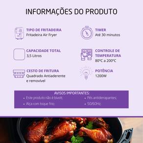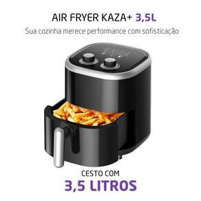 Air Fryer Kaza+ 3,5L, 1200W, temperatura ajustável de 80°C a 200°C, timer de até 30 minutos, cesto removível antiaderente, alça com toque frio e pés antiderrapantes.Porta-fio
