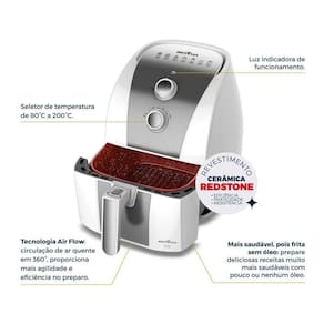 Air Fryer Britânia 5,5L com revestimento Redstone antiaderente, timer de 60 minutos, temperatura ajustável de 80 a 200°C, sistema de proteção contra sobreaquecimento e base antiderrapante.Porta-fio
