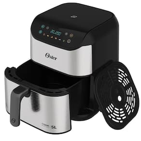Air Fryer Digital Oster OFRT930 com capacidade de 5 litros, design em aço inox, painel digital com funções pré-programadas, timer de 60 minutos e temperatura ajustável de 80°C a 200°C.Porta-fio