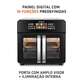 Possui painel touch colorido intuitivo e moderno, com 10 funções pré-programadas para assar, grelhar, fazer pães, bolos e muito mais - tudo com um simples toque. O controle de temperatura e o timer de 90 minutos ajustáveis permitem elaborar receitas com mais precisão. O design moderno em inox traz elegância, enquanto o visor amplo e a iluminação interna oferecem mais controle no acompanhamento dos alimentos.