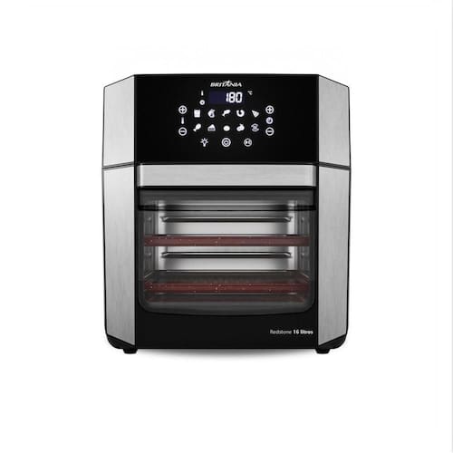 Air Fryer Oven Britânia 16L 4 em 1 com painel digital, 10 funções pré-programadas, controle de temperatura de 80 a 200°C, timer de 90 minutos, acessórios com revestimento antiaderente Redstone e porta removível.Porta-fio