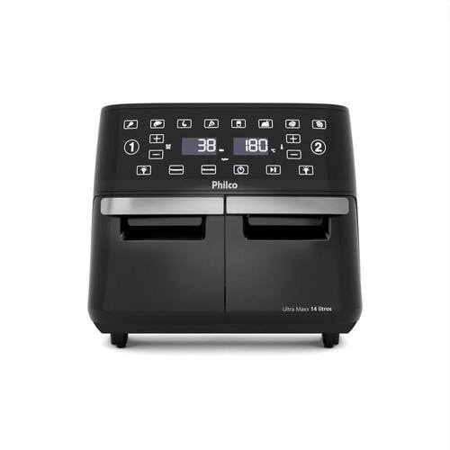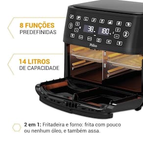 Air Fryer Philco 14L, 4 em 1 (assa, frita, desidrata e reaquece), painel digital, temperatura ajustável de 40 a 200 graus, timer de 60 minutos, cesto antiaderente de 3,5L, luz interna e sistema de proteção contra superaquecimento.Porta-fio