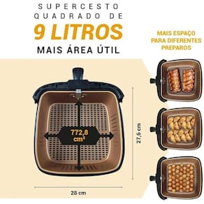 Air Fryer Philco 9L Maxx Gold com capacidade de 9 litros, potência de 2000W, cesto antiaderente Maxx Gold, seletor de temperatura (80 a 200°C), timer de 60 minutos, tecnologia Air Flow 360°.Porta-fio