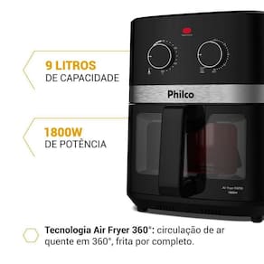 Air Fryer Philco 9L com Visor Glass, Redstone, 1800W, cesto antiaderente, timer de 60 minutos, temperatura ajustável de 80 a 200°C e proteção contra superaquecimento.Porta-fio