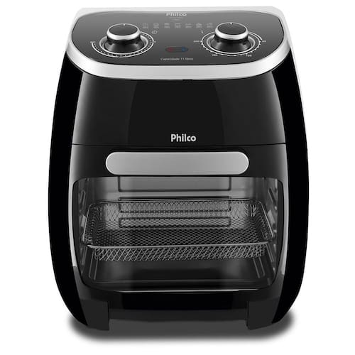Air Fryer Oven 2 em 1 com capacidade de 11 litros. Frita e assa alimentos sem óleo. Seletor de temperatura de 80 a 200 graus. Timer de 60 minutos com desligamento automático. Base antiderrapante. Proteção contra superaquecimento. Luz interna.Porta-fio