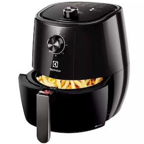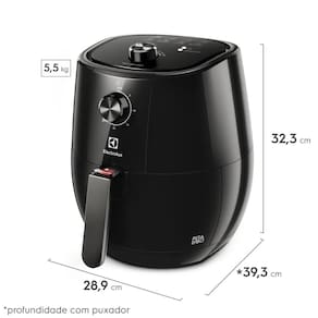 Air Fryer Electrolux 3,2L Preta Efficient 1400W por Rita Lobo (EAF10)->> Como funciona o Controle de Temperatura Intuitivo? -O Controle de Temperatura Intuitivo permite que você selecione a temperatura de forma simples, garantindo que seus alimentos sejam preparados sempre na temperatura correta, proporcionando refeições deliciosas.->> Como a AirFryer reduz calorias e gordura? -Com até 90% menos gordura e quase 50% a menos de calorias¹, a AirFryer Electrolux proporciona uma culinária saudável. Testes realizados demonstraram uma redução significativa de calorias e gordura em comparação com métodos tradicionais de fritura.->> O que o Timer Sonoro oferece? -O Timer Sonoro permite que você selecione o tempo de preparo de forma simples, oferecendo praticidade para realizar outras tarefas enquanto a AirFryer trabalha. Um aviso sonoro indica quando sua refeição está pronta.->> Como é a limpeza da AirFryer Electrolux? -A limpeza é fácil graças ao cesto removível e antiaderente. Basta retirar o cesto e limpá-lo, proporcionando praticidade e facilidade no cuidado com o aparelho.->> Quais são as vantagens das Receitas Pré-Programadas? -As Receitas Pré-Programadas oferecem praticidade, com temperaturas e tempos de preparo já definidos. Prepare pratos conhecidos com a segurança de um resultado perfeito.->> Como funciona o Indicador Luminoso de Funcionamento? -O indicador luminoso informa quando a AirFryer está em funcionamento, proporcionando mais segurança durante o uso.->> O que é o Desligamento Automático? -Passado o tempo pré-definido no timer, a AirFryer desliga automaticamente, garantindo que seus alimentos não passem do ponto, proporcionando praticidade e evitando preocupações.->> Qual a Capacidade e Potência da AirFryer Electrolux? -Com uma capacidade de 3,2L e potência de 1400W, nossa AirFryer oferece o tamanho ideal e maior potência para preparar suas receitas de maneira rápida e saudável.->> Quais são as opções de Tensão Elétrica disponíveis? -A AirFryer está disponível em 127V ou 220V, proporcionando flexibilidade para se adequar à sua instalação elétrica.->> Como é a segurança durante o uso da AirFryer Electrolux? -Além do desligamento automático, a AirFryer é projetada com foco na segurança, proporcionando tranquilidade durante o preparo de suas refeições.->> A AirFryer Electrolux é fácil de usar? -Sim, com controles intuitivos e funções pré-programadas, a AirFryer é fácil de usar, permitindo que você desfrute de refeições saudáveis sem complicações.->> Posso encontrar receitas específicas para a AirFryer Electrolux? -Sim, a AirFryer Electrolux é compatível com uma variedade de receitas saudáveis. Consulte o manual do usuário para sugestões ou explore suas próprias criações culinárias.->> Qual é a vida útil esperada da AirFryer Electrolux? -Com manutenção adequada e uso conforme as instruções, a AirFryer Electrolux foi projetada para oferecer durabilidade e desempenho a longo prazo.Ficha Técnica - Air Fryer Electrolux 3,2L Preta Efficient 1400W por Rita Lobo (EAF10)->> Modelo: EAF10->> Tensão Elétrica (V): Disponível em 127V ou 220V->> Capacidade: 3,2L->> Potência (W): 1400->> Peso do Produto: 5,5 kg->> Dimensões do Produto: -Altura: 33,7 cm -Largura: 29 cm -Profundidade: 39,4 cm->> Peso do Produto Embalado: 6,0 kg->> Dimensões do Produto Embalado: -Altura: 37,3 cm -Largura: 32,3 cm -Profundidade: 32,3 cm->> Frequência: 60 Hz->> EAN-13: 7896347181624
