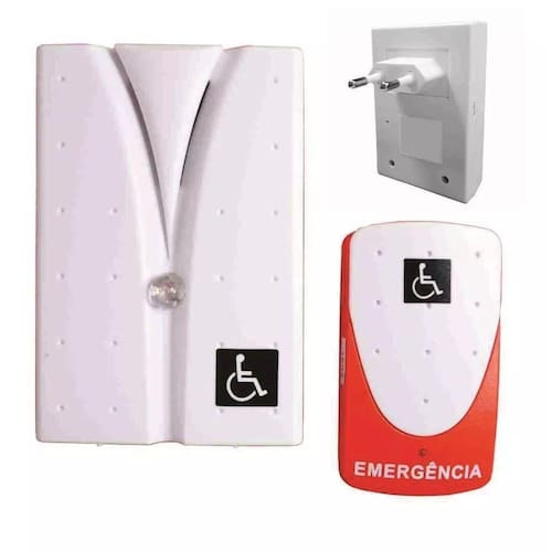 Alarme Audiovisual PNE / PCD Bivolt 127/220V Alarme sem fio com disparo sonoro e visual simultâneo; Para instalação em sanitários acessíveis e para outros ambientes frequentados por pessoas com deficiência,mobilidade reduzida e idosos. Atende os requisitos da ABNT NBR 9050; Tensão de Funcionamento ( Alarme ) : Bivolt 127/220V 50/60Hz; Tensão de Funcionamento ( Acionador ) : 1 bateria 12V tipo A23 ( inclusa ); Princípio de Funcionamento:Ondas de Radiofrequência (RF); Iluminação:LED de Alto Brilho na cor azul ( Efeito Estroboscópico ); Pressão Sonora Aprox.: 100dB ; Consumo Máximo ( Alarme ):100mA; Alcance Máximo entre Alarme e Acionador: até 30m em áreas livres; Quando existirem obstáculos tais como: paredes, lajes, portas, etc, o alcance diminuirá conforme a interferência;