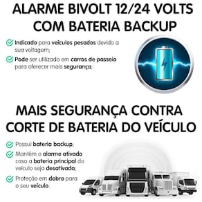 - Alarme Bivolt: compatível com veículos 12V/24V DC;