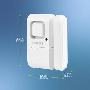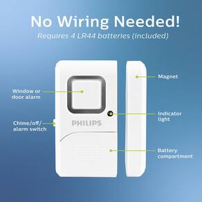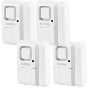 Philips Alarme de janela e porta de segurança pessoal, pacote com 4, proteção DIY, alerta contra roubo, sem fio, campainha/alarme, fácil instalação, ideal para casa, garagem, apartamento, trailer e - Seguro e protegido – afaste possíveis intrusos com um alarme de 120 decibéis acionado por um sensor magnético de alta qualidade, ou escolha um sino soar quando janelas ou portas estiverem abertas e fechadas - Fácil de usar – Possui um interruptor OFF/chime/alarme fácil de usar na lateral do alarme para permitir que você escolha sua preferência de alerta, vem em um conjunto de quatro para fornecer cobertura extra para sua casa - Fácil instalação – Experimente uma montagem completamente sem fios e sem complicações com a fita dupla face incluída, tudo o que você precisa está incluído na caixa - Funciona com bateria – Alimentado por quatro baterias LR44 incluídas e possui um botão de teste de bateria e LED indicador de bateria fraca - Paz de espírito – Este produto de segurança doméstica foi projetado para fortalecer sua casa com uma camada confiável de proteção, permitindo que você viva sua vida sem preocupações