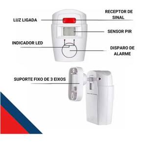 Fixe a base do sensor com a lente direcionada para local a ser monitorado, fixe o sensor na base articulavel acionando o controle remoto, o alarme soara um bip e o led verde ficará aceso armado , permanecendo aceso por 17segundos até sua saida do local e apagando em seguida, permanecendo em estado de alerta stand by economizando energia. Ao entrar em alerta ele toca em torno de 50 segundos e armará novamente automático e permanecerá em stand by, ao entrar onde esta o alarme você terá 5 segundos para desarmá-lo.