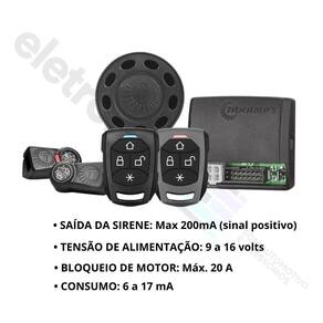 • Tensão de Alimentação: 9 a 16 Volts • Consumo: 6 a 17 mA • Bloqueio de Motor: Máx. 20 A • Saídas de Setas 2 x 70W c/ proteção digital • Saídas de Trava, Destrava, Auxiliar 1 E 2: Máx. 200 mA - (Sinal Negativo) • Saída Auxiliar 3 e Controle de Som: Máximo 200 mA - (Sinal Positivo) • Dimensão Embalagem: 140 x 100 x 65 mm • Peso Embalagem: 0,35 Kg