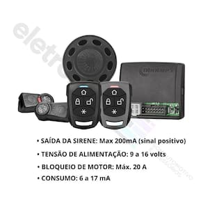 • Tensão de Alimentação: 9 a 16 Volts • Consumo: 6 a 17 mA • Bloqueio de Motor: Máx. 20 A • Saídas de Setas 2 x 70W c/ proteção digital • Saídas de Trava, Destrava, Auxiliar 1 E 2: Máx. 200 mA - (Sinal Negativo) • Saída Auxiliar 3 e Controle de Som: Máximo 200 mA - (Sinal Positivo) • Dimensão Embalagem: 140 x 100 x 65 mm • Peso Embalagem: 0,35 Kg
