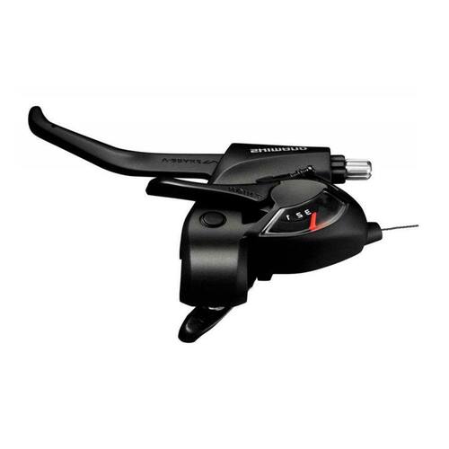 ALAVANCA CÂMBIO/FREIO SHIMANO TOURNEY ST-EF41 V-BRAKE OU DISCO MECÂNICO DIANTEIRO ESQUERDO - 3V Especificações: - Marca: SHIMANO; - Linha: TOURNEY; - Modelo: TOURNEY ST-EF41-L; - Lado: Esquerdo; - Sistema: EZ FIRE PLUS; - Compatível com: 3 coroas e sistema de freio mecânico por cabo de aço (V-Brake ou Disco Mecânico); - Indicado para relação 3x7v ou 3x8v; - Possui indicador de posição de Marcha (display) - Fixação: Abraçadeira; - Manete de freio: 2 dedos; - Ajuste de distância entre a manopla e o manete: SIM; - Compatível com todos os freios MECÂNICO - V-BRAKE ou DISCO; - Acompanha: Alavanca Esquerda p/ 3 coroas, cabo de câmbio Shimano em aço, Manete de freio mecânico - NÃO ACOMPANHA CABO DE FREIO; - Material: Aço e Plástico; - Cor: Preto; - Peso: 265g; Observação: - Anúncio unitário; - Não acompanha cabo de freio / conduite para instalação do sistema de freio.