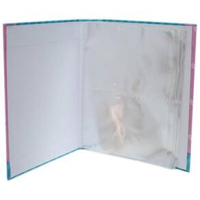 Parte externa: folhas plásticas transparentes com repartições para as fotos