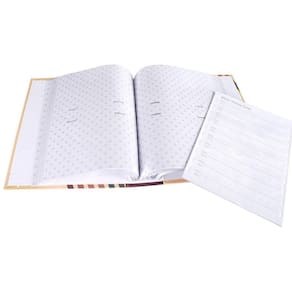 Parte interna: folhas brancas com plástico transparentes com repartições para as fotos