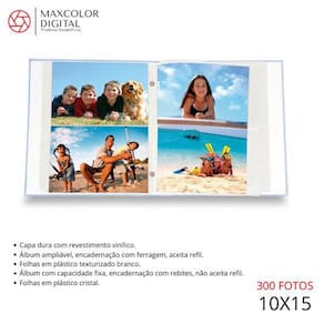 Especificações Álbum ampliável, encadernação com ferragem, aceita refil. Capa dura impressa com laminação fosca. Folhas em plástico texturizado branco. Álbum com capacidade fixa, encadernação com rebites, não aceita refil. Capa dura impressa com laminação brilhante. Folhas em plástico cristal.