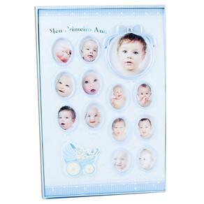 Álbum Fotografico Bebê primeiro aninho 180 fotos 10 x 15 cm com campos para principais anotações do seu bebêPossui 12 janelinhas pequenas e 1 maior na capa.Histórico e 6 páginas autocolantes.Tamanho do Álbum 34 cm x 24 cm x 5 cm Marca: Buenos Imports