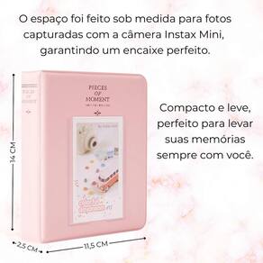 Álbum capa dura premium porta retrato para foto instax mini Cor: lilás dê um toque especial às suas lembranças com o álbum para foto instax mini disponível em diversas cores vibrantes, ele oferece estilo e proteção para suas fotos favoritas. com capa dura resistente e um design pensado para organização, o álbum possui 64 espaços perfeitos para armazenar suas memórias com segurança e praticidade. Além disso, você pode personalizar a capa frontal com uma de suas fotos preferidas, tornando-o único e especial. cada compartimento é projetado sob medida para fotos de câmera instax mini, com o tamanho ideal de 8,5 cm de altura por 5,5 cm de largura, garantindo um encaixe perfeito e preservando suas recordações para sempre. leve suas melhores lembranças com você compacto e leve, esse álbum é perfeito para carregar e exibir seus momentos especiais onde quer que vá. Organize suas fotos com estilo ------------------ ------------------ quantas fotos cabem no álbum R: o álbum possui capacidade para armazenar até 64 fotos, organizadas de maneira prática e segura. quais são as dimensões das fotos que cabem no álbum R: ele é projetado para fotos com 8,5 cm de altura e 5,5 cm de largura, sendo ideal para fotos capturadas com a câmera instax mini. o álbum possui capa dura R: sim, o álbum possui uma capa dura resistente que protege suas memórias e ainda permite personalizar a capa frontal com uma foto. ------------------ Especificações ------------------ Capacidade: 64 fotos. Dimensões das fotos: 8,5 cm altura x 5,5 cm largura . Dimensões do álbum: 14 cm altura x 11,5 cm largura . Compatibilidade de fotos: câmera instax mini. ------------------ Conteúdo ------------------ 1x álbum de fotos. Anúncio referente a álbum Acessórios que ambientam as fotos não inclusos. ------------------ Apresentação: ------------------ - qualidade garantida. - atendimento qualificado. - enviamos para todo o brasil. - compra garantida. - despachamos em até 1 dia útil após confirmação do pagamento Garantimos a devolução por arrependimento em até 7 dias, após o recebimento e de 15 dias contra defeitos de fabricação. Marca: Não Informado