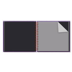 Capa dura, miolo com 30 folhas pretas 180 g/m2 (encorpadas), folhas protetoras intercaladas, formato 21,8 cm × 23,5 cm, encadernação em wire-o. Acompanha capa protetora transparente. Embalagem em caixa de papel kraft e tampa em acetato transparente. Medidas: 30cm x 27cm x 3cm, fechamento com tag adesiva com mensagem.