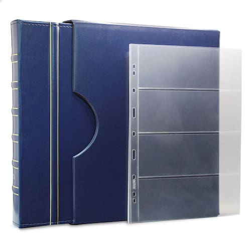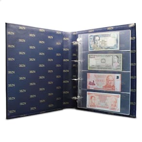 O Álbum de Luxo Azul 20 Folhas para 80 Cédulas 3BZN G é um kit de fichário que acompanha folhas para cédulas em acetato tamanho 32x24cm, a transparência da folha é alta e cristalina, de forma que é possível ver sua cédula sem interferências, e de ambos os lados: frente e verso, dessa forma é possível apreciar sua coleção da melhor forma. Esse kit de folhas é feito em um material resistente sendo o principal organizador de cédulas colecionáveis para colecionador.