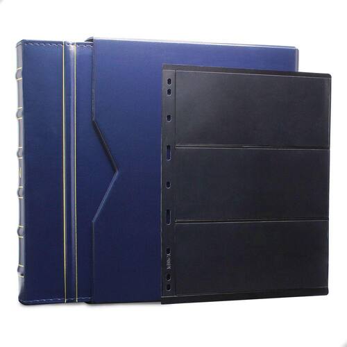 O Álbum de Luxo Azul 30 Folhas para 180 Selos 3BZN P é um kit de fichário que acompanha folhas para selos em acetato preto tamanho 28x21cm, a transparência da folha é alta e cristalina, de forma que é possível ver sua cédula sem interferências, dessa forma é possível apreciar sua coleção da melhor forma. Esse kit de folhas é feito em um material resistente sendo o principal organizador de cédulas colecionáveis para colecionador.