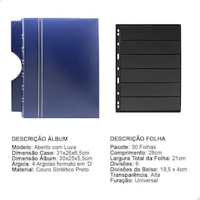 O Álbum de Luxo Azul 30 Folhas para 360 Selos 3BZN P é um kit de fichário que acompanha folhas para selos em acetato preto tamanho 28x21cm, a transparência da folha é alta e cristalina, de forma que é possível ver sua cédula sem interferências, dessa forma é possível apreciar sua coleção da melhor forma. Esse kit de folhas é feito em um material resistente sendo o principal organizador de cédulas colecionáveis para colecionador.