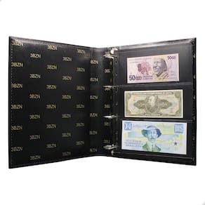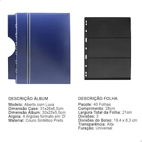 O Álbum de Luxo Azul 40 Folhas para 240 Selos 3BZN P é um kit de fichário que acompanha folhas para selos em acetato preto tamanho 28x21cm, a transparência da folha é alta e cristalina, de forma que é possível ver sua cédula sem interferências, dessa forma é possível apreciar sua coleção da melhor forma. Esse kit de folhas é feito em um material resistente sendo o principal organizador de cédulas colecionáveis para colecionador.