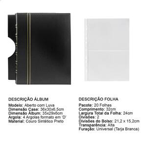 O Álbum de Luxo Preto 20 Folhas PP para 40 Cédulas 3BZN G é um kit de fichário que acompanha Folhas PP. Seu acabamento é transparente, podendo visualizar as cédulas frente e verso. Essa folha é ideal para você criar aquele mostruário que sempre desejou com sua coleção de cédulas antigas, nacionais ou estrangeras e finalmente poder mostrar sua coleção toda organizada para sua família e amigos.