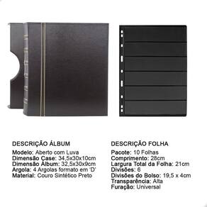 Álbum Fichário Luxo Preto Gigante 10 Folhas para Selos 6 Espaços 28x21