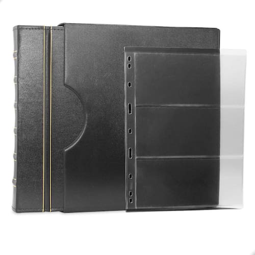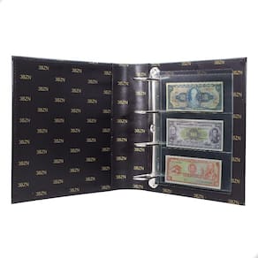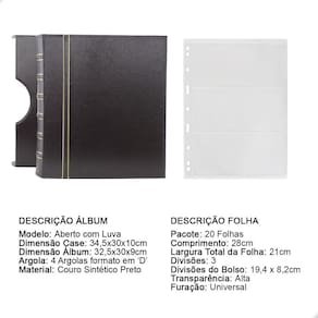O Álbum Fichário Luxo Preto Gigante 20 Folhas para Cédulas 3 Espaços 28x21 , é um kit de fichário que acompanha folhas para cédulas em acetato tamanho 28x21cm, a transparência da folha é alta e cristalina, de forma que é possível ver sua cédula sem interferências, e de ambos os lados: frente e verso, dessa forma é possível apreciar sua coleção da melhor forma. Esse kit de folhas é feito em um material resistente sendo o principal organizador de cédulas colecionáveis para colecionador.
