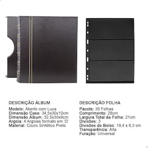Álbum Fichário Luxo Preto Gigante 30 Folhas para Selos 3 Espaços 28x21