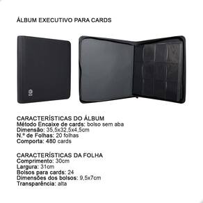 Álbum Executivo para CardsO Álbum Executivo para Cards contém 20 folhas, cada folha tem 24 bolsos, sendo 12 bolsos na frente da folha e 12 no verso. O álbum possui zíper.A abertura dos bolsos para cards é pela lateral. Para colocar seu card no bolso da folha você deve abrir o bolso que deseja guardar o card e o inserir com cuidado. Posicione-o corretamente para ficar alinhada, e pronto.CARACTERÍSTICAS DO ÁLBUMMétodo Encaixe de cards: bolso sem abaDimensão: 35,5x32,5x4,5cmN.º de Folhas: 20 folhasComporta: 480 cardsCARACTERÍSTICAS DA FOLHAComprimento: 30cmLargura: 31cmBolsos para cards: 24Dimensões dos bolsos: 9,5x7cmTransparência: alta Marca: Não Informado