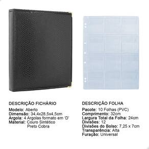 Álbum Fichário 10 Folhas para 120 Moedas 32x24 Cobra GF é um kit de fichário que acompanha folhas para Moedas tamanho 32x24cm, a transparência da folha é alta e cristalina, de forma que é possível ver sua moeda sem interferências, e de ambos os lados: frente e verso, dessa forma é possível apreciar sua coleção da melhor forma. Esse kit de folhas é feito em um material resistente sendo o principal organizador de moedas colecionáveis.