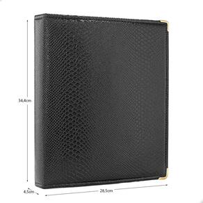 O fichário é produzido em capa sintética com cantoneiras para proteção, material de alta qualidade para armazenar com segurança e de forma organizada sua coleção, ele é muito resistente confeccionado com 4 argolas em formato ‘D’ em aço inoxidável reforçado, permitindo o encaixe da folha de até 32x24cm, processo de fabricação artesanal permitindo um excelente acabamento.