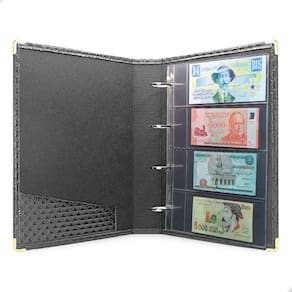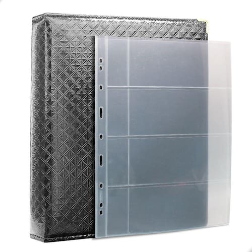 Álbum Fichário 10 Folhas para Cédulas 4 Espaços com Bolso 32x24 Cobra Fosco G, é um kit de fichário que acompanha folhas para cédulas em acetato tamanho 32x24cm, a transparência da folha é alta e cristalina, de forma que é possível ver sua cédula sem interferências, e de ambos os lados: frente e verso, dessa forma é possível apreciar sua coleção da melhor forma. Esse kit de folhas é feito em um material resistente sendo o principal organizador de cédulas colecionáveis para colecionador.