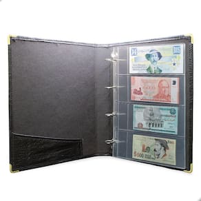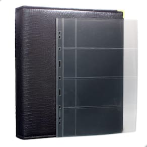 Álbum Fichário 10 Folhas para Cédulas 4 Espaços com Bolso 32x24 Cobra Fosco GF, é um kit de fichário que acompanha folhas para cédulas em acetato tamanho 32x24cm, a transparência da folha é alta e cristalina, de forma que é possível ver sua cédula sem interferências, e de ambos os lados: frente e verso, dessa forma é possível apreciar sua coleção da melhor forma. Esse kit de folhas é feito em um material resistente sendo o principal organizador de cédulas colecionáveis para colecionador.