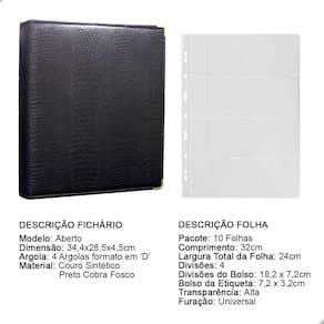 O fichário é produzido em capa sintética com cantoneiras para proteção, material de alta qualidade para armazenar com segurança e de forma organizada sua coleção, ele é muito resistente confeccionado com 4 argolas em formato ‘D’ em aço inoxidável reforçado, permitindo o encaixe da folha de até 32x24cm, processo de fabricação artesanal permitindo um excelente acabamento.